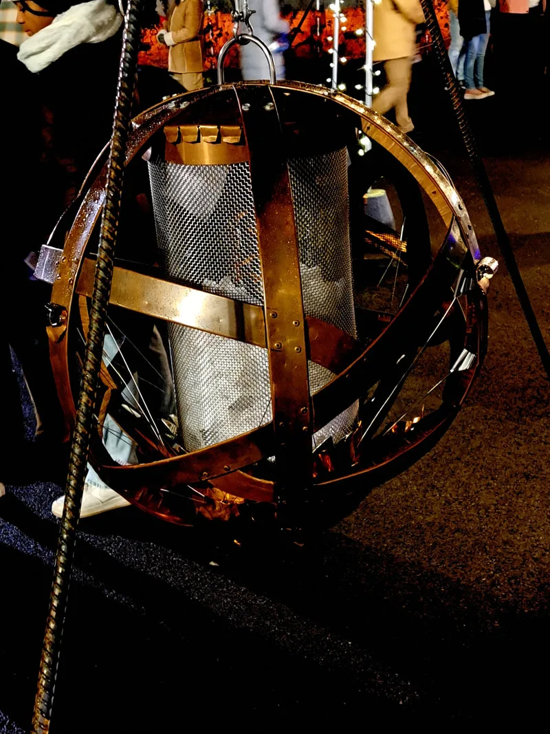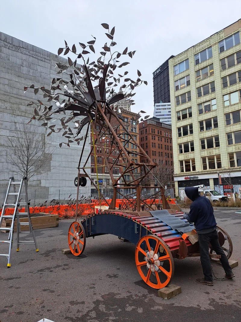 Branches are attached at ground level, then the tree is raised using an industrial hand winch.