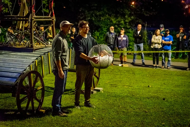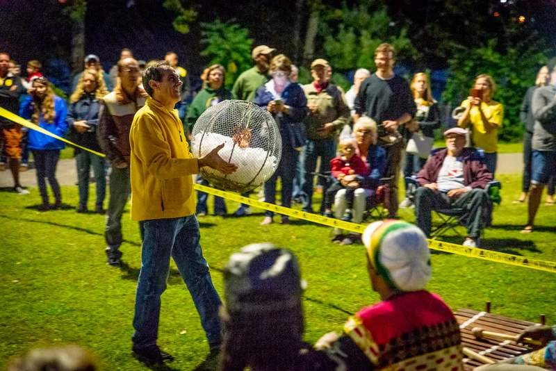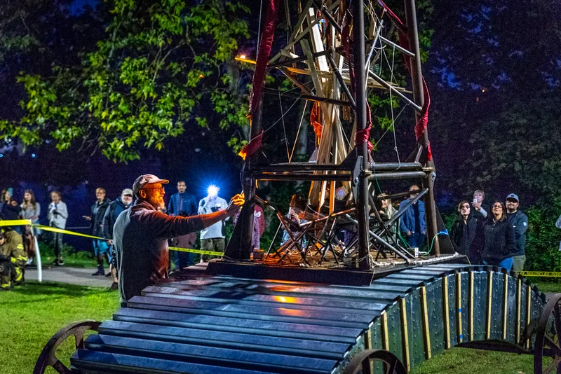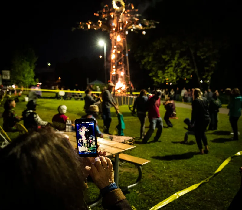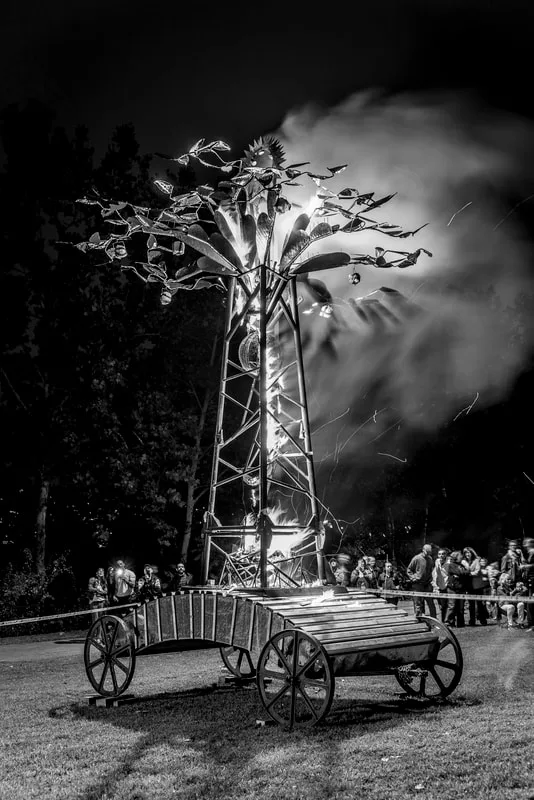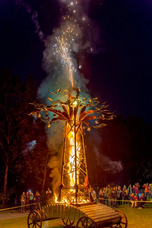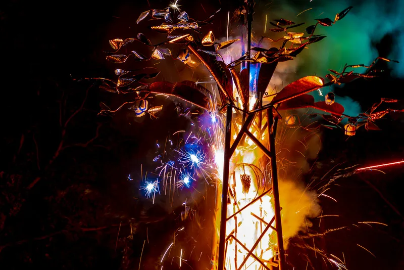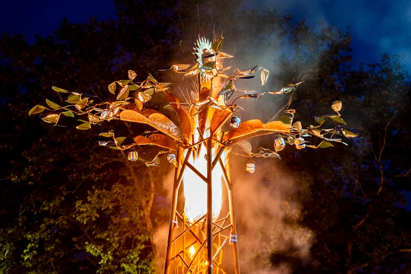 High in the trunk of Firetree hangs a sphere containing ambitions for the world written by event participants on highly flammable paper. During a Firetree Celebration, one spark ignites these messages into a powerful expression of possibility.