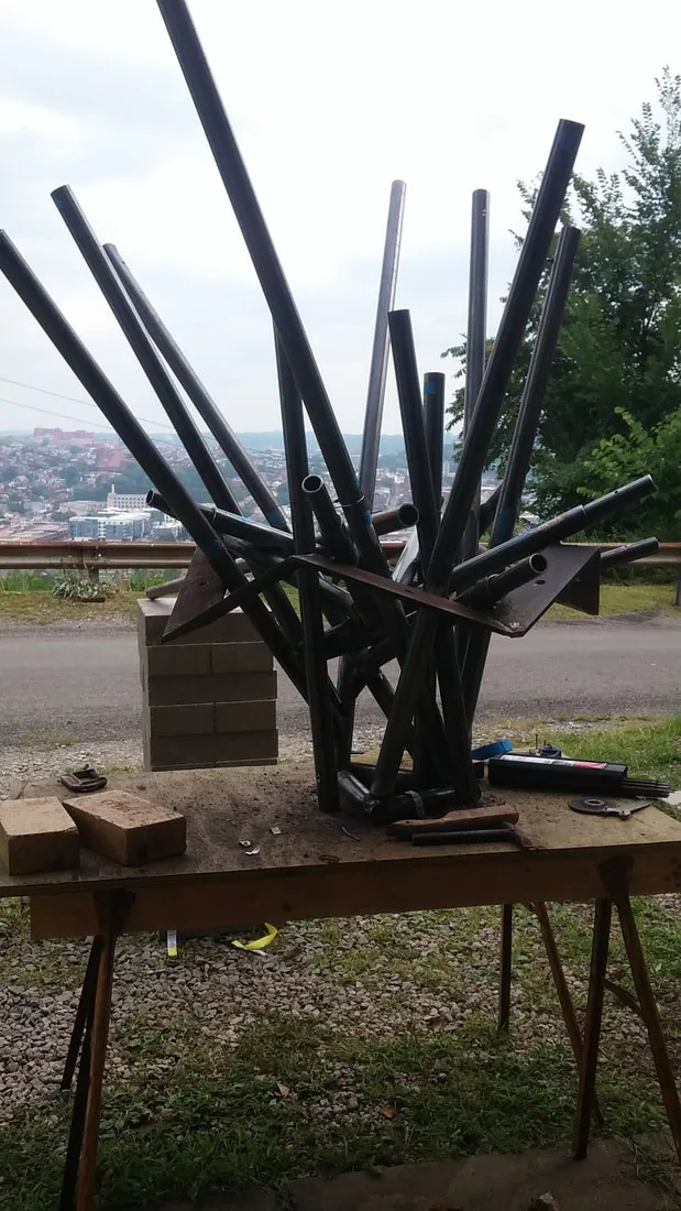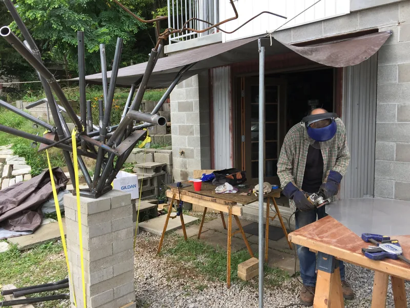 Working directly from his small model for measurements and positioning, Duncan began building the branches of the tree. Dusting off an old, stick welder that he had purchased 20 years earlier for $50. Not knowing how to weld, he asked a fellow sculptor to give him a tutorial. That instruction was enough to start the steel tree fabrication. A local metal worker let him use his shop for ordering materials, cutting the steel pipe, and made the difficult welds for the steel collar at the top of the trunk.