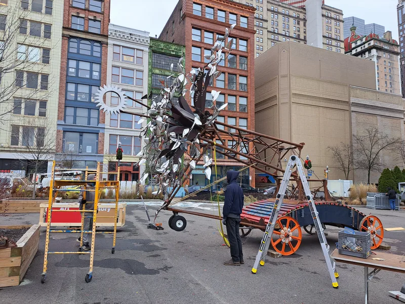 Branches are attached at ground level, then the tree is raised using an industrial hand winch.